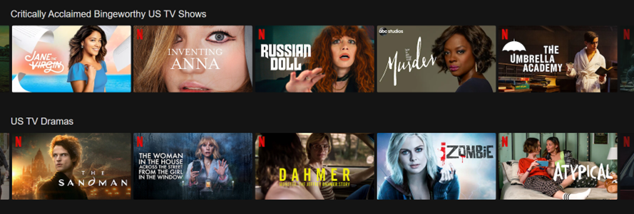 Interestingly, Netflix discards the cinematic film posters and replaces them with a character’s face showing intense emotion relating to the genre of the film/series e.g. a scared face to signify horror. These location-specific thumbnails show how Netflix draws the viewer in using extreme close-ups to create a personal connection and a tailored viewing experience.