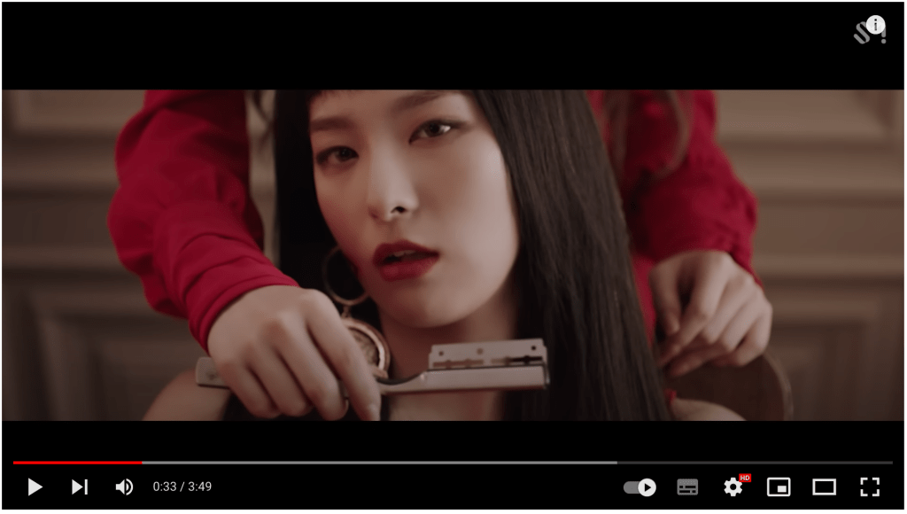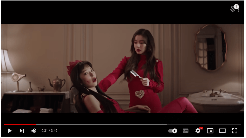 Korean idol group Red Velvet’s music videos are all very narrative, especially Peek a boo. This music video is roughly about five teenage girls (possibly five split personalities) who kill a pizza delivery boy. This mv is wonderful in that it has many hints, all hinting at where the whole story is going. For example, two members of the group, Seulgi and Irene, appear shortly after the ‘story’ begins, with Seulgi sitting in a chair and Irene holding a razor to Seulgi‘s neck. (Figure 5 & 6) The two elements, the person in the chair and the razor make the audience think of Sweeney Todd. Sweeney Todd, the barber, is a serial killer in a British novel. He sets up a trap in a chair in a barber shop and slits the throats of rich people with a razor to kill them and rob them of their money, so this image implies that these two girls are playing Barber Todd’s ‘killing game’. There are many more of these hints driving the story in this music video.
