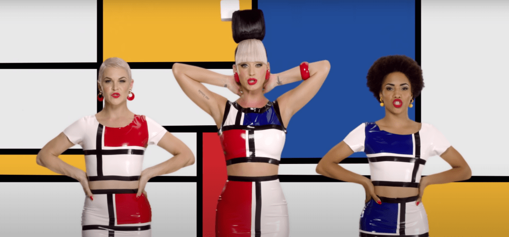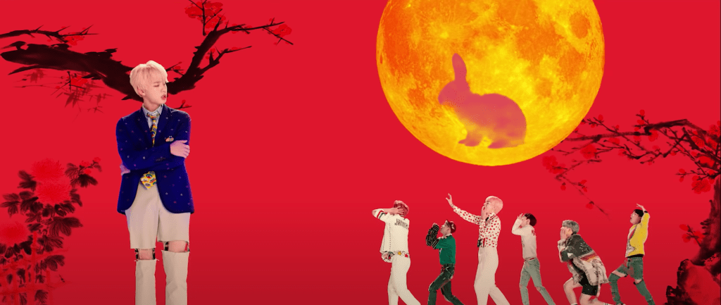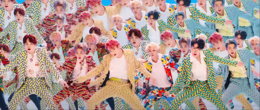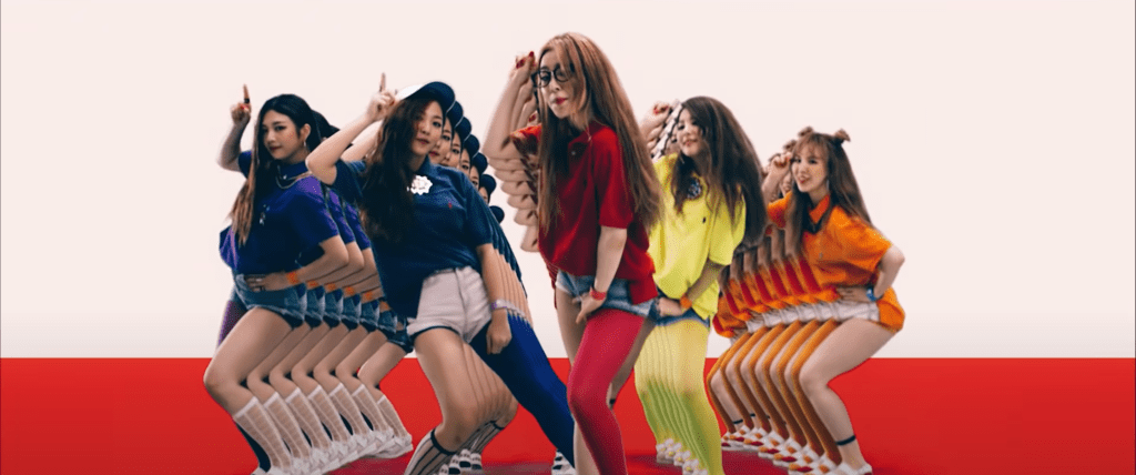 The music video ‘Dumb Dumb‘ (2015) by the Korean girl group Red Velvet also features a number of creative, two-dimensional scenes. See Figure 8 for example, where the keyed images of people are overlaid one after the other on a two-dimensional background in time with the repetition of the word “dumb” in lyrics.