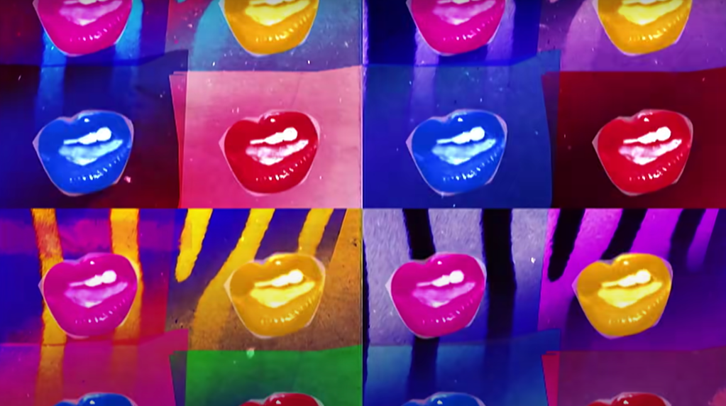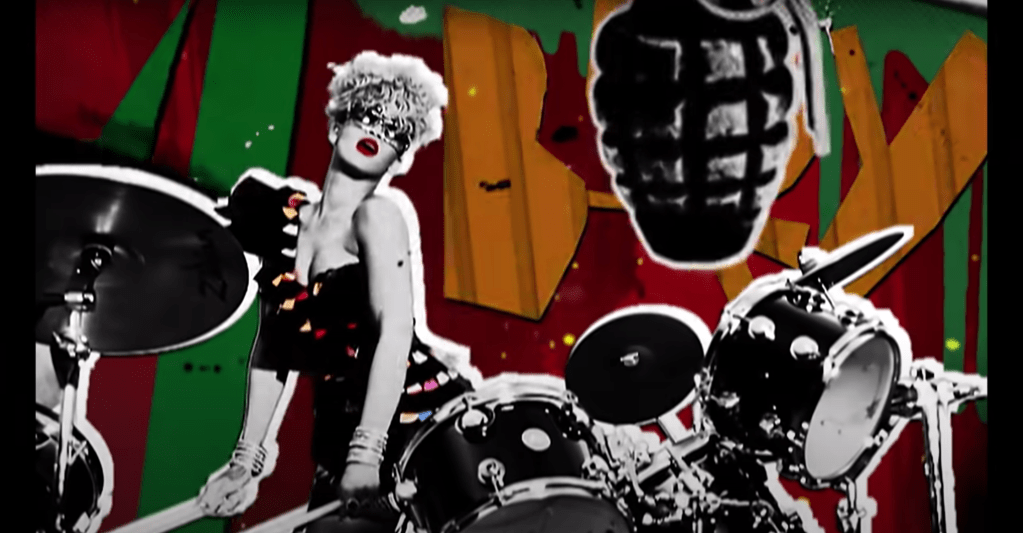 The diverse music video techniques not only demonstrate a mixing-board aesthetic, but also produce and explore new audiovisual relations. Rihanna’s music video ‘Rude Boy‘(2010), for example, features a large number of composite images that stimulate the viewer’s sensibilities. Rude Boy uses a lot of brightly coloured shots and cuts them quickly to create a strong visual clash. Notably, Rude Boy uses very two-dimensional visual effects, using image matting to overlay the dynamic figures (such as Rihanna playing drums or dancing) (see Figure 1 & 2) or other elements (moving lips) (see Figure 3) together with abstract graphic background. This visually abandons three-dimensional space.