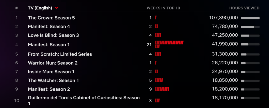 All in all, The Crown has been an undeniable success as a Netflix Original series and has brought Netflix a lot of revenue and viewership. The Crown has attracted 1.1 million viewers since the premiere of its fifth season and was Netflix’s top-rated drama in the English language from November 7th to 13th (see Figure 1).
