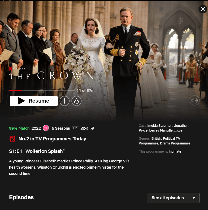 Netflix recently released the fifth season of The Crown on November 9, and so far The Crown’s ranked second among Netflix’s TV Programmes.