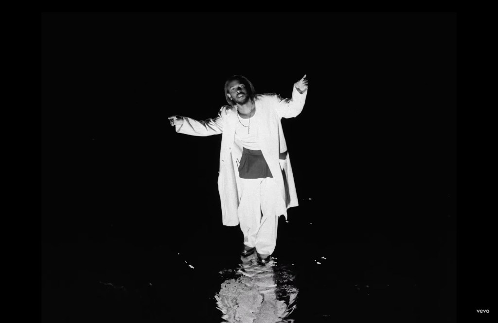 The video opens in a 3:2 aspect ratio, with a black kid overlooking an ocean, which eventually reveals the first taste of post-cinematic/VFX. Kendrick is floating above the water, posed like Jesus Christ’s crucifixion, reciting some “true stories”. It is not beyond Kendrick to refer to himself as a god – or the son of, in this case -, and he uses post-cinema to achieve that look, talking presumably to the boy – Kendrick’s past – sitting on the shore. The end result of his floating body looks very unnatural, rather cardboard-like, but Kendrick uses the post-cinema here as an exaggeration, to send a message across; not to elevate the visual cues of his video.