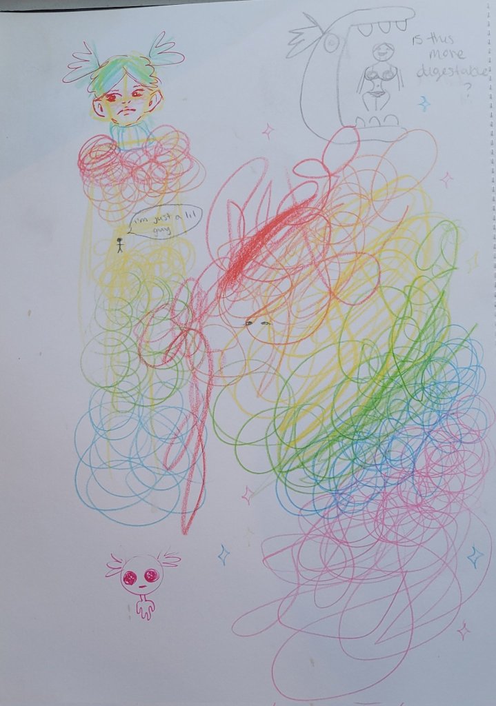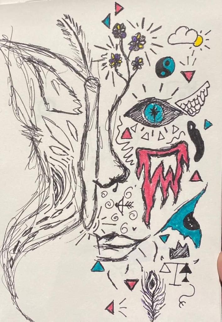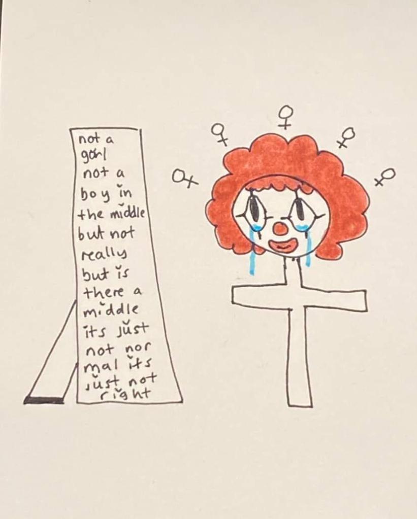 Last year I completed my BA Sociology dissertation focussing on the embodied experiences of gender from the personal accounts of transgender individuals. Using arts based research, participants created two “visual representations of [their] gender identity,” (Burgess 2023:2) from both their perspective, and the perspective of wider society. As such, the two drawings produced by each participant were strikingly contrast; while visual representations of participants self-constructed gender identity were expressive and abstract, visual representations of participants socially constructed gender identity blended both realist portraiture and absurdist caricature.