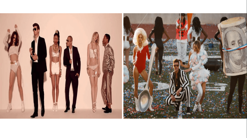 Gender representation in music videos can sometimes become problematic. Women are commonly presented as sexual objects or submissive characters, which reinforce patriarchal norms and objectify them for male pleasure. Although sexual objectification is commonplace in media culture, music videos provide the most potent examples of it (Frisby 2011). This not only limits women’s representation, but also conveys viewers a negative message about gender roles and expectations. For example, Robin Thicke’s ‘Give it 2 U’ or ‘Blurred Lines’. One of the most common complaints levelled at these songs is that their lyrics create a culture of sexual objectification. Both songs’ lyrics plainly depict women as things to be chased and conquered. This not only promotes gender stereotypes, but also leads to a culture in which consent is ambiguous, potentially resulting in harm. Additionally, the explicit material of the music videos for these songs has drawn controversy. In the video for “Blurred Lines,” Thicke and his collaborators are surrounded by scantily clad women presented as servile objects of desire. This depiction reinforces detrimental power relations by sending the notion that women exist primarily for male pleasure. The determining male gaze projects its fantasy onto the female figure, which is styled accordingly (Mulvey 1975).