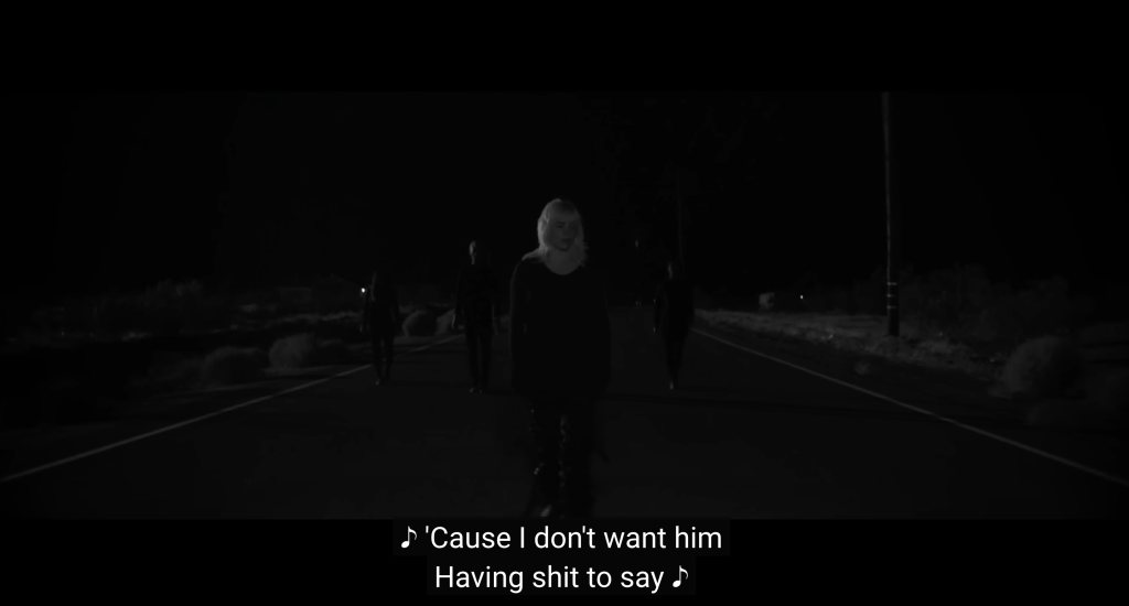 To begin with, rhythmic subtlety faced challenges in the 1980s due to technological limitations, with video clips predominantly edited on video, often without timecode (Vernallis, 2013:217). Currently, artists can synchronize the rhythm of the video with the music, emphasizing the seamless integration of sound and image (Vernallis, 2013:209). For example, Billie Eilish in “NDA” passes down a dark highway dressed entirely in black. Obscure figures in the background follow her and then vanish perfectly on time when she glances back. This unfolds as she continues to walk along the road, creating a sense of unease as the shot length is surprisingly precise.