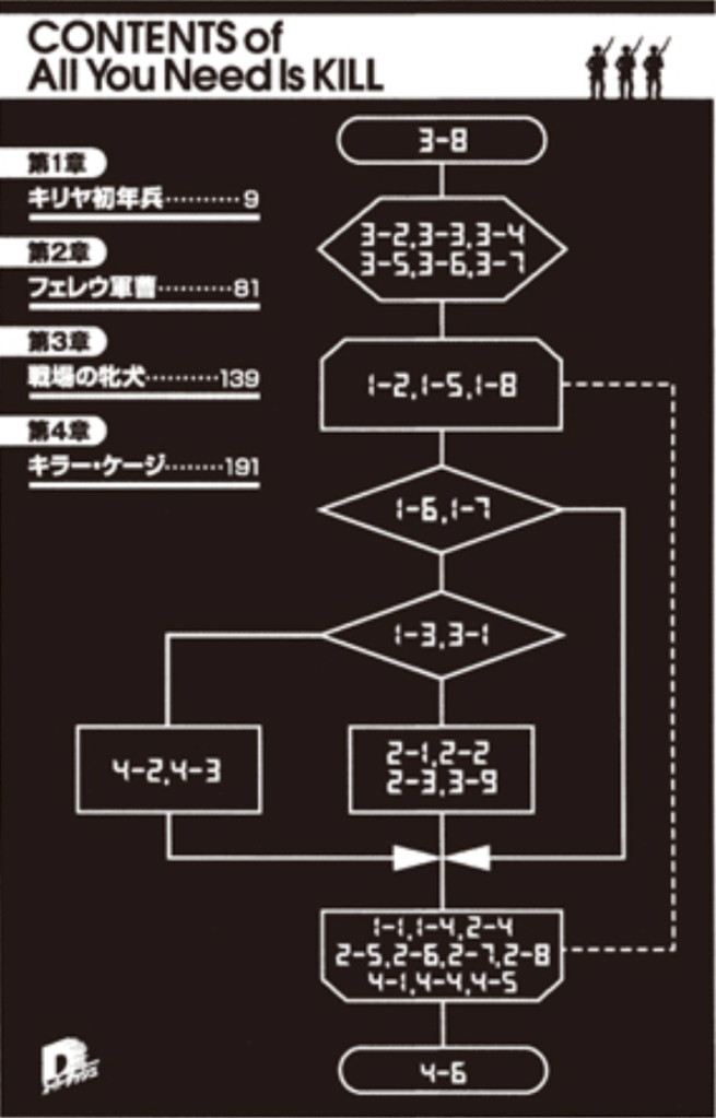 Hiroki Azuma uses the concept of ‘game-like realism’ to analyse the original novel as a work with a new style of realism. ‘Game-like realism’ is defined as ‘metanarrative realism’, which doubles the perspective of the player playing the game (external perspective) with the internal perspective of the characters in the diegesis(Azuma, 2007). The protagonist of this work, Major Cage, discovers a strategy for defeating his enemies by repeatedly dying and being resurrected. This is a basic strategy for players of action games (and would also apply to Source Code).