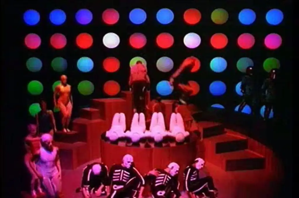 Unlike many music videos where dance routines serve as mere decoration, the intricate planning in this video ensures that every element is meaningful. Groups of dancers, such as skeletons and synchronized swimmers, interact dynamically, weaving through one another to create a cohesive performance that mirrors the song’s structure. Near the end, all groups join the robots in a single-file circle, symbolizing how the different musical elements come together. This interplay of time and space in the choreography reflects a concept similar to Gilles Deleuze’s analysis of cinema. Here, time and space are not separate but intertwined, with each group’s movements visually representing a specific musical layer, creating a rhythm that transcends linear progression. The vibrant staging, including a giant wall of flashing lights that change colors, pays homage to the disco era, further merging visual aesthetics with auditory experience. Gondry’s video transforms the song into a multi-sensory spectacle, where the blending of time, space, sound, and vision elevates the music into an iconic cultural artifact.