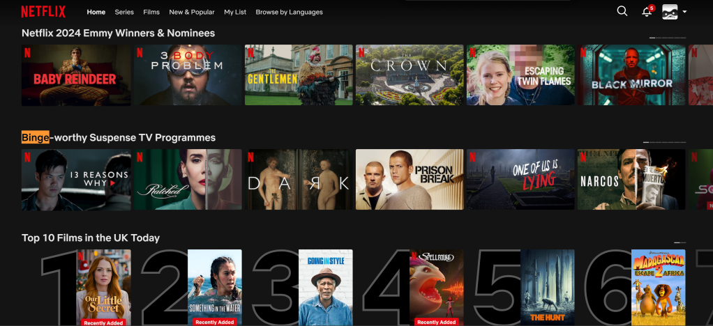 We are accustomed to thinking Netflix offers us more control and choice when in reality, the intentional design choices control us. Features like “entrance flow” guide us with recommendations for new shows to binge, while “insulated flow” moves us from one episode to another effortlessly (Jenner, 2018, 115). This model is deliberately done to organize our viewing experience. Unlike traditional TV, Netflix is non-linear and not time-specific, encouraging unlimited viewing in one sitting (Lotz, 2017, pg. 15). Therefore, even when a series is finished, it will nudge viewers to watch another (Jenner, 2018, 14-23).
