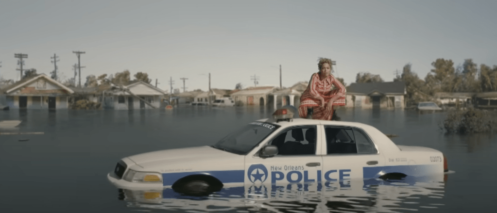 By using a montage approach to blend compelling images and situations, Formation creates a political message rather than adhering to a conventional storytelling style with a distinct beginning, middle, and end. In particular, pictures of flooded New Orleans cars and police cruisers hint at the systematic brutality and neglect that the black population has to deal with.