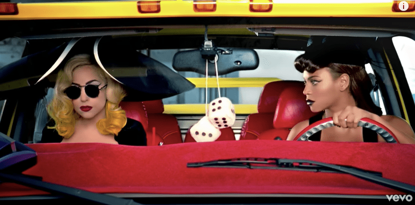 Mise-en-scene is evident throughout the music video shown through various theatrical elements like vibrant costumes, hyper-feminine outfits and hyper-realistic, saturated backdrops. It is used to display political criticisms in striking ways, like Gaga’s prison outfit- industrial chains around her neck with cigarette-embellished sunglasses- which symbolises rebellion and social entrapment.