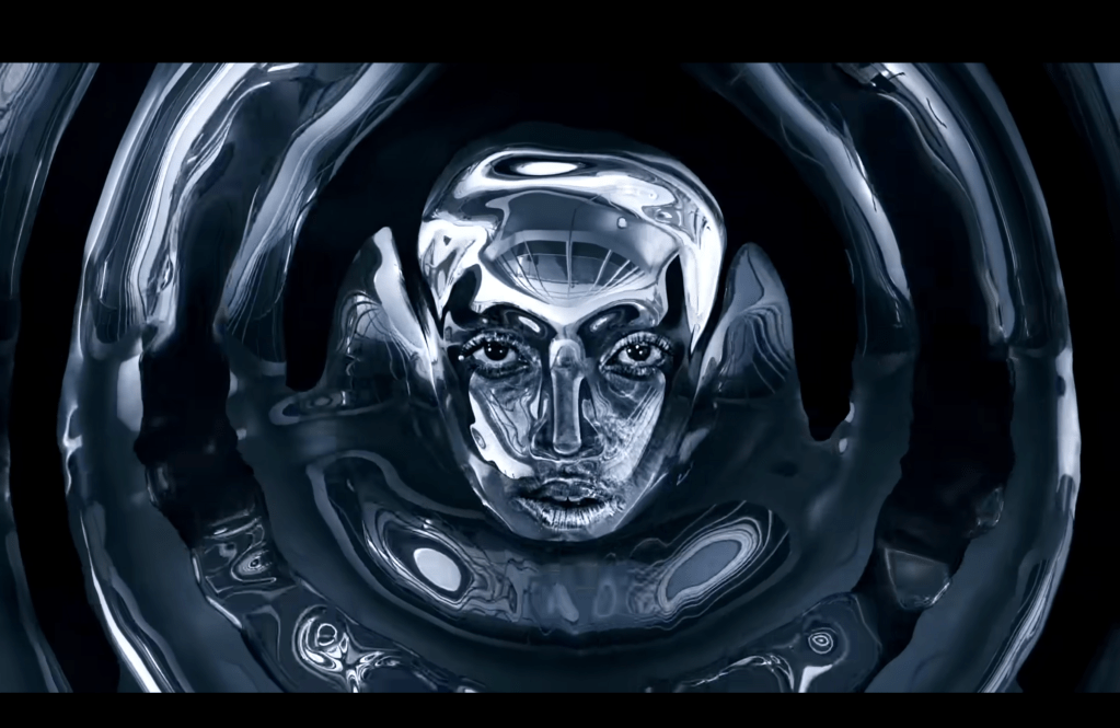 However, in the next shot, as she sinks into the abyss of liquid metal, she is shown as a flesh-and-blood human being. Here, her whole body is shown against a white background and bright lighting, and at the same time her powerful dance is shown, with the camera focusing on her gaze. In a complete change from previous scenes in this video, here she seems to be expressing a kind of liberation from herself. At the very least, here we see a figure that is far removed from the image of the fetishised and dehumanised woman under the gaze of the male (Benson-Allott, p. 131.).