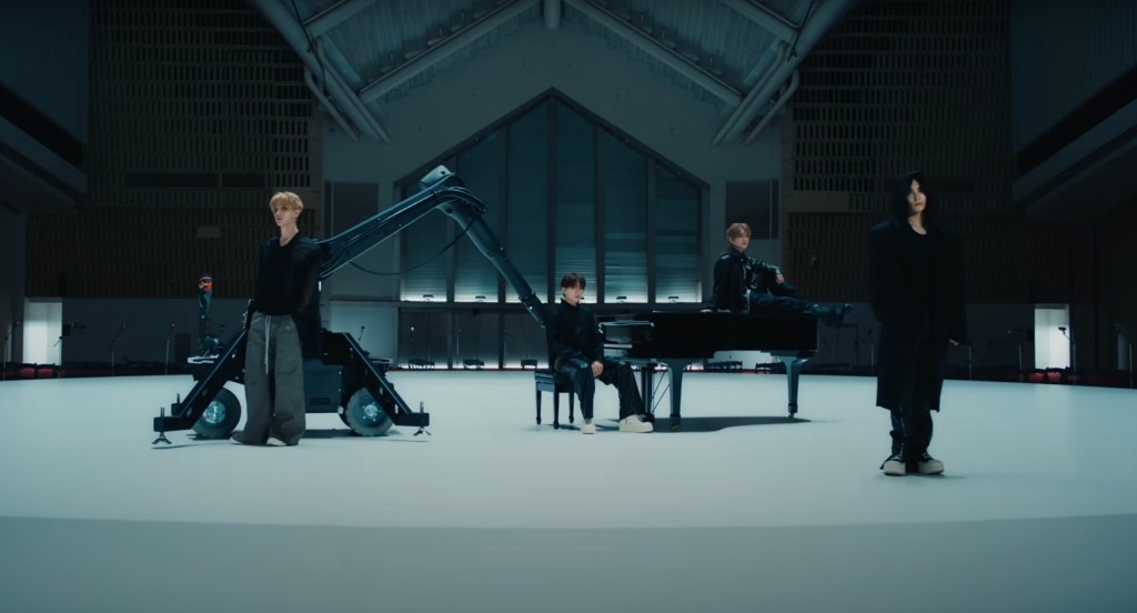 Gina Arnold and her team say that music videos are still important, even as technology changes how we watch them—from MTV to YouTube (Arnold et al., 2017). SEVENTEEN’s Maestro reflects this evolution. It doesn’t just promote their song but also delivers a message about technology’s impact on art. The opening scenes show a lifeless world full of machines and robots, with humans looking dull and robotic. This suggests that when AI takes over, human creativity might fade away. These visuals make Maestro feel more like a story or a warning than just a performance.