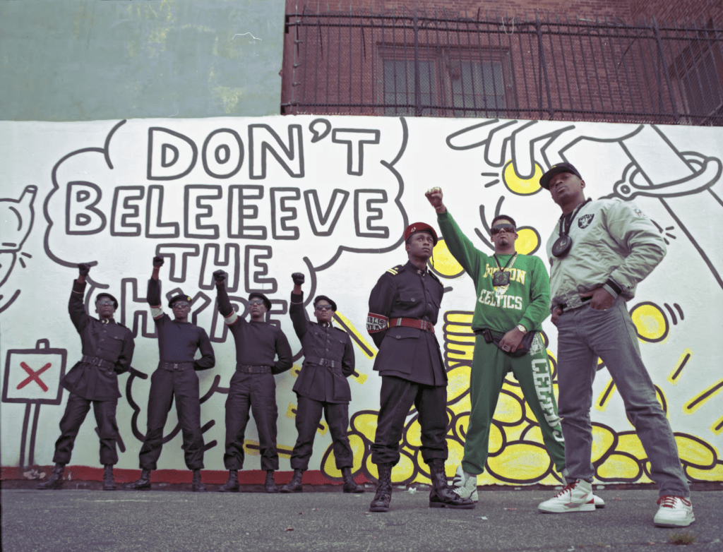 Vocalist Chuck D reflects on the battle with the government with its power structures create and sustain systemic racism and blaxploitation. He expresses the deep-rooted nature of the racial problem, arguing he feels he will always pose a threat to those in power, ‘my skin has been seen as more hostile than anything I could say. Black people, our skin is noisy.’ Regardless, they embrace their culture and empower their historical resistance to exploitation and political abuse with reference to the Black Panther movement in their clothing. He continues, ‘it was enhanced by a video… had a film behind it’ as well as a whole movement from New York, illustrating its immense cultural value and influence as it punches its way into the political sphere.