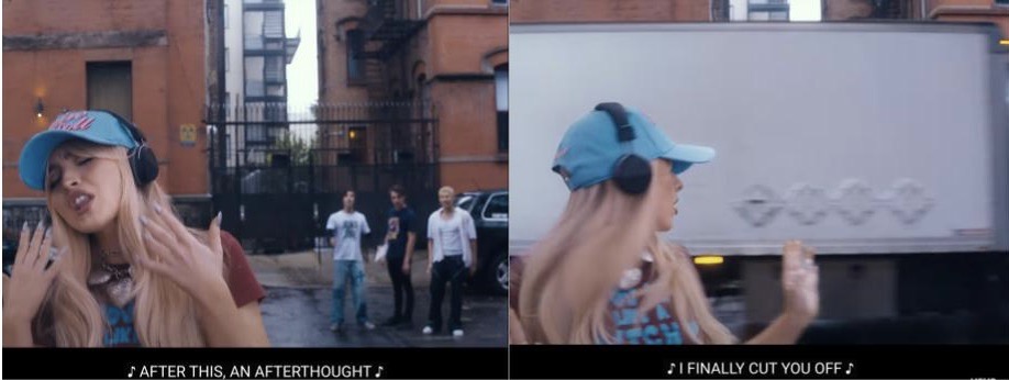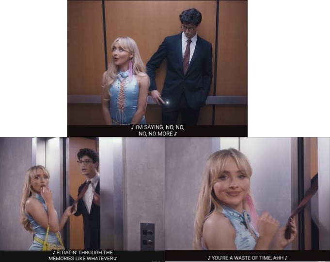 In one scene, Sabrina walks down the street, obliviously dancing as a crowd of men follows her. Their pursuit ends in poetic justice when they are hit by a truck, symbolising revenge on those who make women feel unsafe in public spaces.