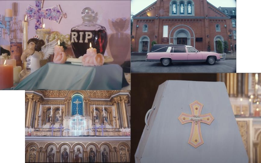 The video opens with a funeral scene where Sabrina, seemingly happy rather than grieving, celebrates the death of a man who was “just okay.” The church is adorned with overtly ‘girly’ pink objects, reflecting gender stereotypes.