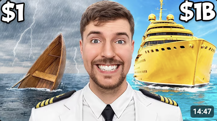 Considering his videos gain a minimum of 100 million views, it could be said that his videos are algorithm driven. With the constant loud and amped up atmosphere, his videos are very much attention grabbing and definitely over stimulating. The thumbnails of his videos also represent very over saturated and loud images and texts to hook their audience. They are also mainly kept simple and straightforward where the thumbnail is broken into two sides comparing for example 1 dollar yachts vs 1,000,000,000 dollar yachts or before and after almost AI looking photos with a cut out of him smiling which are meant to maximize click through rates. His videos are also kept short with the average of about 15 minutes and about 30 until 40 minutes for the extended challenges. His videos align with Vernallis’ Accelerated Aesthetic theory due to the intense visuals, fast paced and high energy editing which reflects the now overstimulated, short attention span and attention driven culture of digital media.